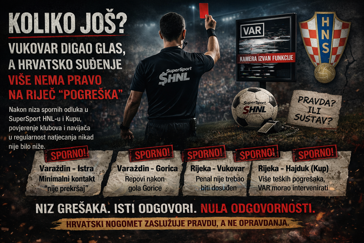 A sada, nakon svega toga, dolazimo do Vukovara i Lokomotive. U trenutku kada se svaki bod broji kao zlato, kada donji dio tablice gori i kada se klubovima sezona lomi iz kola u kolo, dobili smo još jednu situaciju koja otvara više pitanja nego što daje odgovora. Ako je ključna kamera za procjenu zaleđa bila izvan funkcije, kako je moguće da se uopće dođe do odluke koja nosi toliku težinu bez pune tehničke sigurnosti? Ako se već koristi VAR kao vrhovni alat preciznosti, kako je moguće da javnost, klubovi i gledatelji ostanu bez jasne i uvjerljive prezentacije onoga što je presudilo? I najvažnije — koliko puta se još mora dogoditi ista stvar da bi netko priznao da problem više nije epizodan, nego strukturalan?